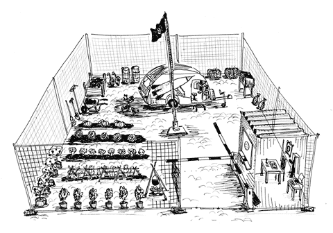 Der „Kompostaat“ von Johannes Jensen ist ein Staat im Staate, der flexibel heute in Rheydt und morgen in Pawlodar installiert werden kann. Ein Bauzaun grenzt das Terrain zur BRD ab. Ein Blick hindurch zeigt Kleingarten-Idylle pur: freilaufende Hühner, Salatköpfe und Tomaten, eine Feuerstelle etc. ermöglichen dem Staatsoberhaupt, dem Künstler, ein Leben als Selbstversorger. Im krassen Gegensatz dazu steht die Rakete, die im Caravan untergebracht ist. Sie ist jederzeit abschussbereit. Und das Grenzhäuschen mit Schranke ist einfach notwendig. Es dient der eigenen Sicherheit. Schließlich muss man sich schützen – manchmal auch vor den “eigenen” Leuten.